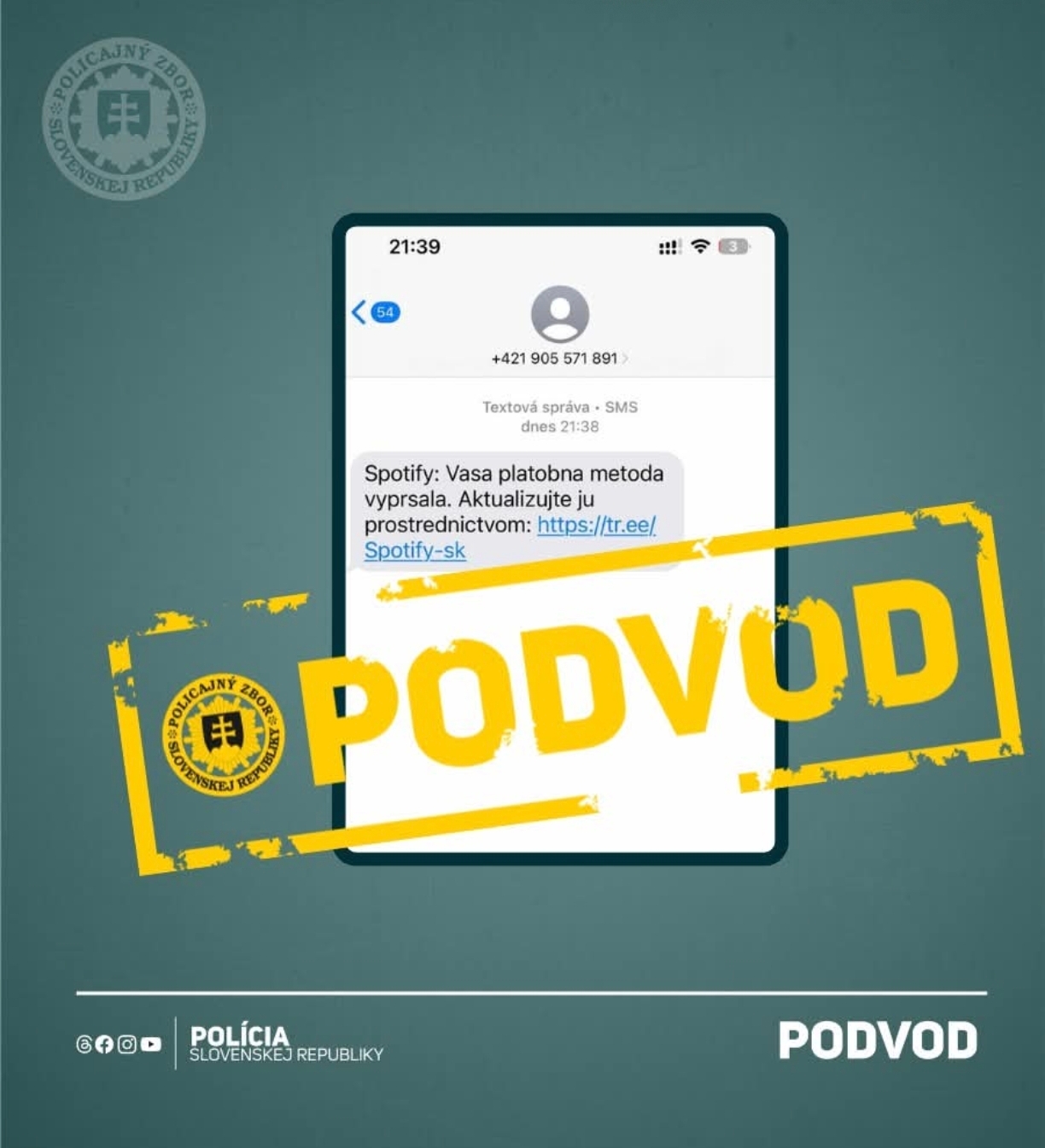 Polícia upozorňuje na nový podvod, ktorý sa na Slovensku šíri prostredníctvom mobilných telefónov. Ide o podvodnú SMS správu, ktorá sa v posledných dňoch masívne šíri Slovenskom a zneužíva meno služby Spotify. Správa vyzýva používateľov, aby si údajne aktualizovali platobné údaje, inak im bude zrušený prístup k účtu. Ide však o klasický phishingový podvod.