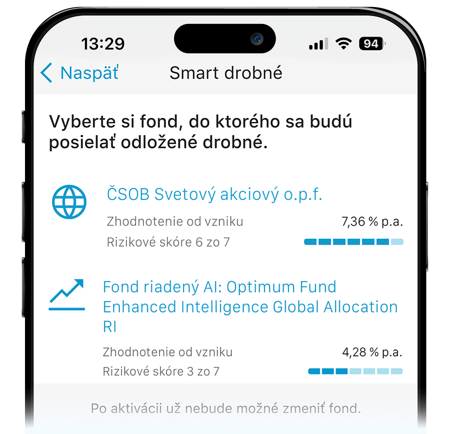 Fond si vyberiete pri aktivácii služby. Na výber máte Fond riadený AI: Enhanced Intelligence a ČSOB Svetový akciový.