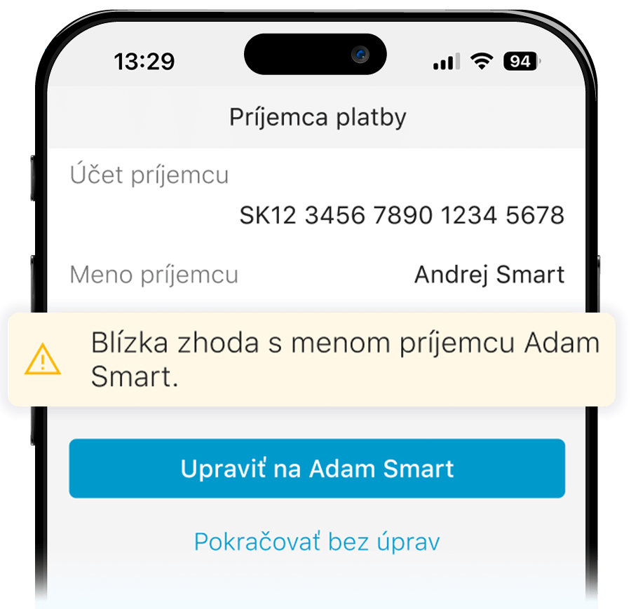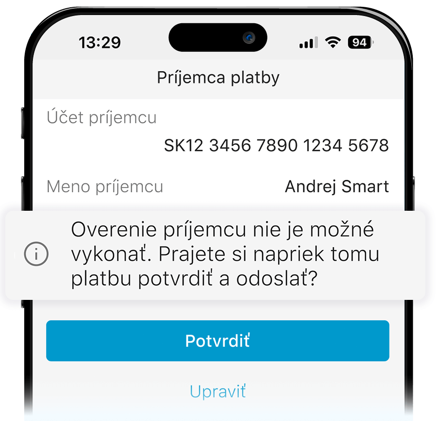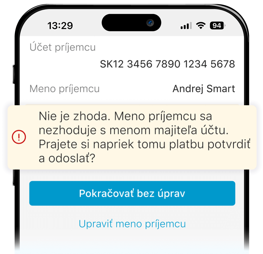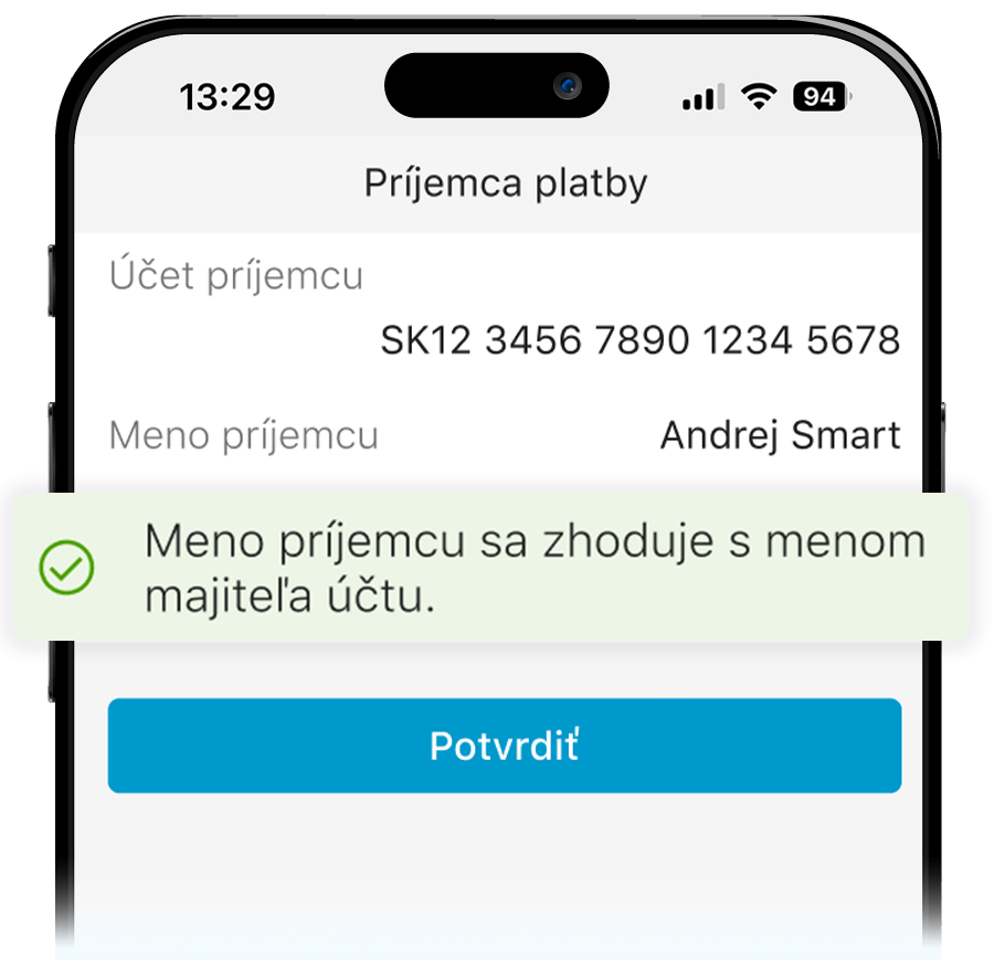 Pri zadávaní SEPA platby zadáte číslo účtu a meno príjemcu. Overíme meno v banke príjemcu a zobrazíme výsledok overenia pred autorizáciou.