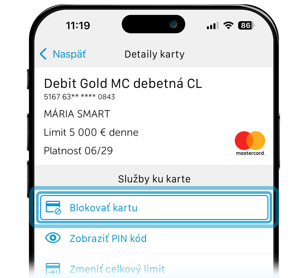 - Kartu môžete dočasne zabezpečiť v aplikácií SmartBanking